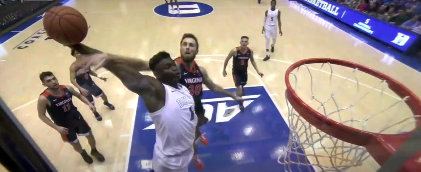 Cam Reddish opened the scoring for Duke with a step-back three to beat the shot clock (1:40), flashing his range and versatility. De’Andre Hunter keyed the UVA offense to start the game, with seven early points. Meanwhile, Duke went to work on the offensive glass for nine second chance points, including a put back slam from Jack White (4:35). In between two dunks by Jay Huff, R.J. Barrett drilled a three from a dribble hand-off action (12:48). Duke would use variations of DHO and weave action throughout the game to help create space against Coach Bennett’s pack line defense. Zion then scored seven quick points, beginning with his coast to coast slam through four Cavalier defenders (16:05). The replay is incredible.
