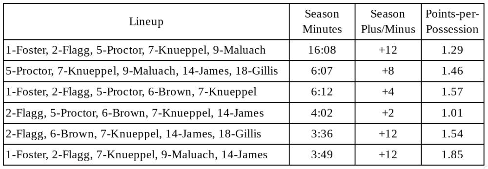 After a few more games, I’ll start to include various statistics from the season, but I’d like to let the sample size increase a little first. In the meantime, let’s take a look at Duke’s lineups from the first two games. Coach Scheyer used 28 different five-man combinations, with six different lineups appearing in both games. Again, it’s a small sample size, but here are the most used lineups so far this season.