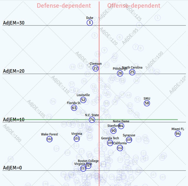 With conference play starting last weekend, I wanted to look at analytics across the ACC. Ken Pomeroy’s D-I Universe tool allows you to view a variety of statistics, and filter by conferences. Here’s how adjusted efficiency margin looked across the ACC prior to the beginning of league play on December 7th.1 The team’s national rank in AdjEM is noted in the circle, and the green line indicates the average margin for Division I.