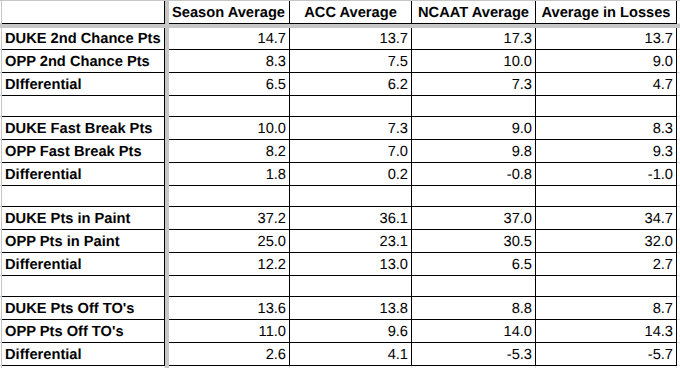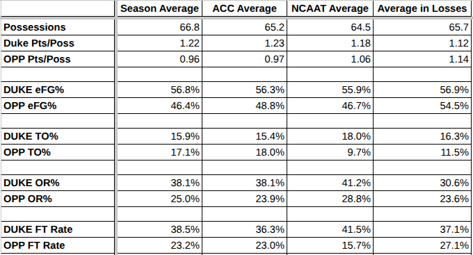 Duke did an excellent job keeping their opponents off the free throw line, finishing second nationally in defensive free throw rate, but opponents were able to get to the stripe ~4% more often in losses. A few additional fouls 1) stop the clock, 2) potentially put guys in foul trouble, and 3) put the opponent in the bonus more quickly.
