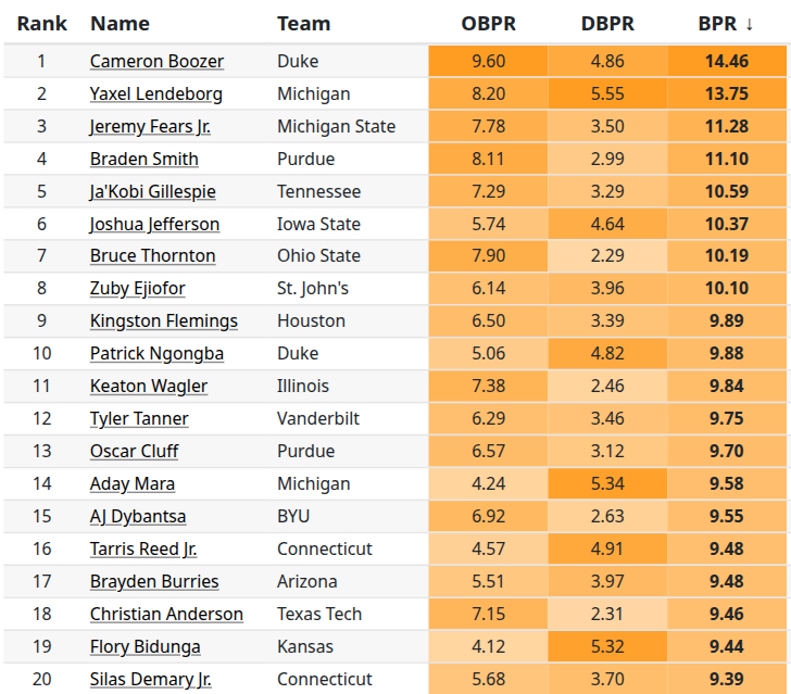 Evan Miya also debuted a new player performance rating this season. It’s no surprise the analytics support the NPOY hardware for Cam Boozer. But what went under the radar to most was Pat Ngongba’s impact on both ends of the floor for Duke. Pat finished second on the team in offensive rating (126.6), fourth in assist rate (16.9%), and first in blocked shot rate (6.0%).9