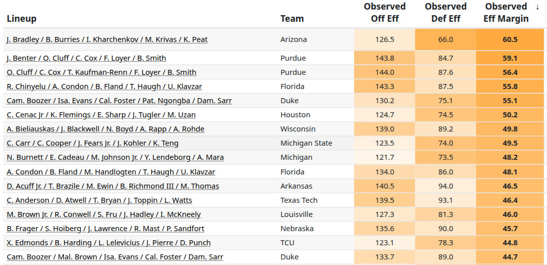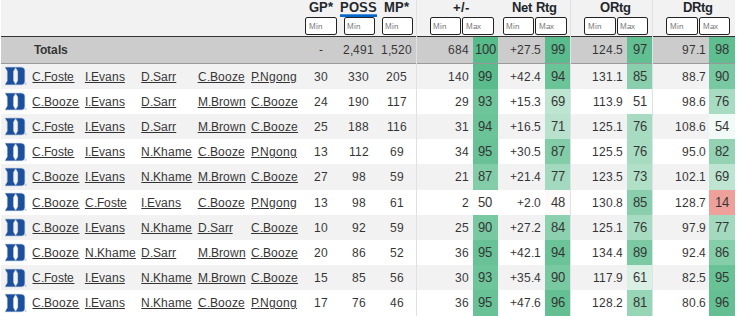 In fact, Duke had two of the top lineups in the country according to EvanMiya (150+ possessions). Unfortunately, Duke’s best lineup was only able to log 330 possessions on the year. For context, Arizona’s top combo was on the floor for over 750 possessions, Houston’s for over 600 possessions, and Michigan’s for over 450 possessions.
