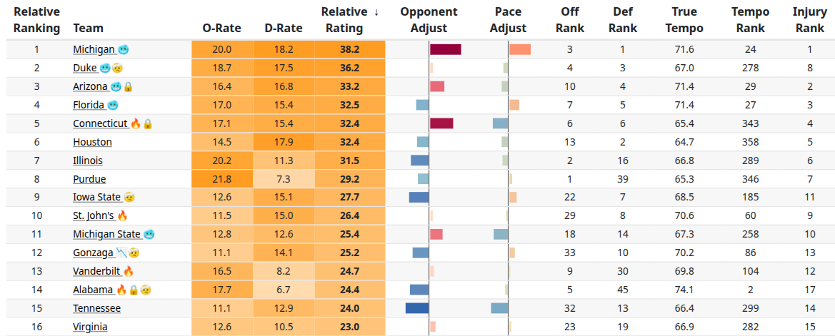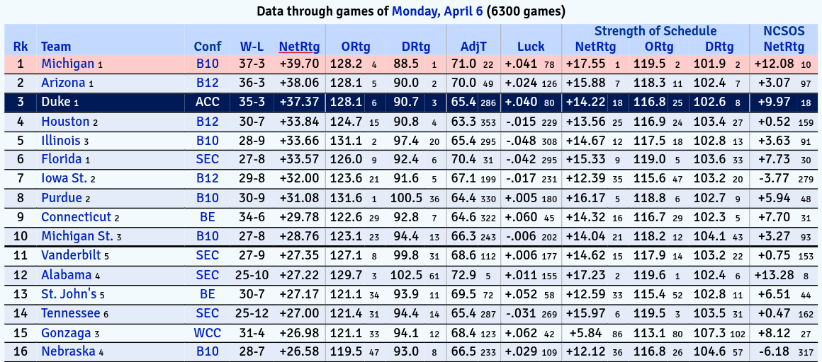 Duke finished #3 in Ken Pomeroy’s final rankings (+37.37), with the 6th best offensive rating (128.1) and 3rd best defensive rating (90.7). Via Evan Miyakawa, the Blue Devils finished #2 overall (+36.2).