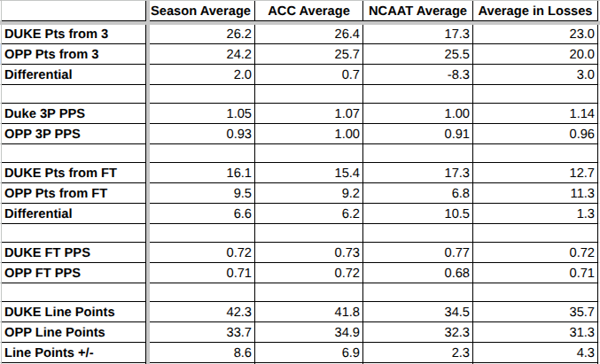 If you’ve been reading for a while, you know I’m fond of line points as a key metric (points from 3 + points from FT). Obviously, all points count the same, and Duke was dominant from two-point range this season, shooting 60.2% inside the arc (7th nationally) while generating 1.21 points-per-shot and outscoring teams by ~9.5 points per game on twos. The majority of Duke’s advantage in line points came from free throws, with three-point scoring virtually even on the season. Opponents only shot 30.6% from three-point range on the year, but made 11 of 14 triples down the stretch in Duke’s three losses.8