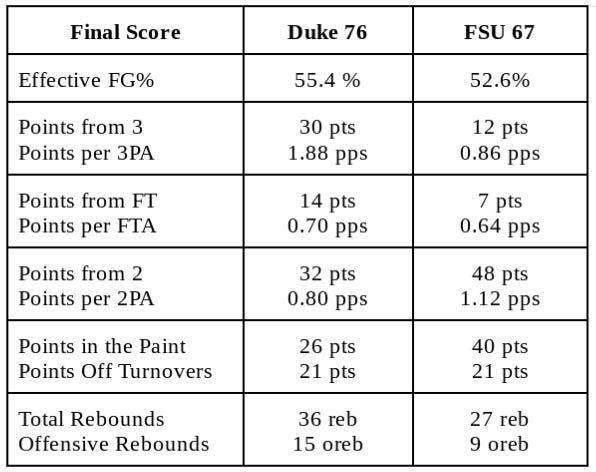 With 10 assists to 17 turnovers (0.59 ratio), it was only Duke’s third game of the season with an assist-to-turnover rate of less than 1.00. Credit Florida State’s switching defense and active hands for making it difficult for the Blue Devils to run their offense. The Seminoles made 7 of their first 8 field goal attempts for an early 16-11 lead, but would only score 51 points for the remaining 35:04. Duke outscored FSU 13-5 in second chance points, while grabbing 13 offensive rebounds after halftime. Duke’s 10 of 16 performance from three-point range, including 7 of 8 for Jared McCain in the first half, helped offset Florida State’s +14 margin in points in the paint. McCain finished with 35 points, matching Zion Williamson’s record for points in a game by a Duke freshman.