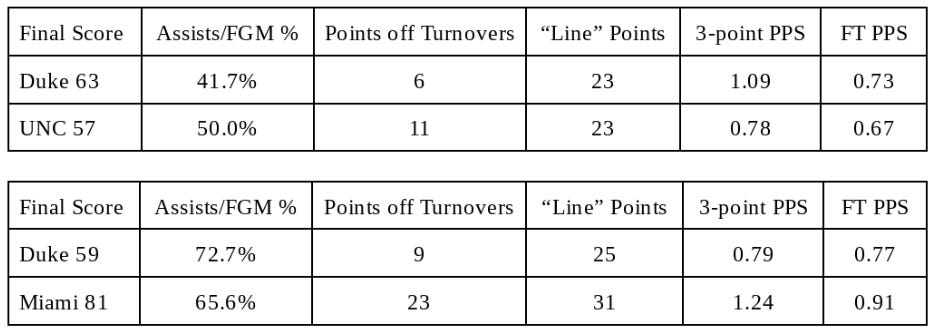 Duke was able to do a pretty good job taking care of the ball against North Carolina, especially in the second half, allowing just 4 points off 5 turnovers after the break. Duke’s 63 points marked their lowest total since January 4th in Raleigh, so it was a big plus for the Blue Devils to keep the turnovers in check against a UNC defense that was difficult to score against. Unfortunately, it was a different story in Coral Gables, as Duke turned it over 21 times for 23 Miami points. That was uncharacteristic for the Blue Devils of late. In the previous 8 games, 13 points off turnovers was the most Duke had given any opponent.