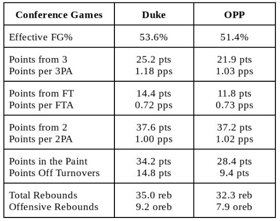 Duke’s 16 offensive rebounds were a season-high to this point, leading to a 21-2 advantage in second chance points, despite Notre Dame grabbing 13 offensive boards of their own. In the first half, Notre Dame outscored Duke 10-2 in points off turnovers. After halftime, the Blue Devils responded by only turning it over twice, while gaining a 24-10 edge in points in the paint. Notre Dame’s 39.8% effective field goal percentage was the lowest for a Duke opponent so far in conference play. Since the conference season just passed the midway point, I wanted to present Duke’s averages through 10 ACC games (last night is not included below).