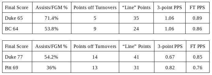 Rebounding is another stat that was key in both victories. Against Pittsburgh, it was easy to see - Duke had 19 second chance points compared to 8 for Pitt and out-rebounded the Panthers 51-28 overall. At Boston College, both teams finished with a total of 11 second chance points but it was 6-0 in favor of BC at the half. The 11 second chance points after the break were huge for Duke, especially with points being tough to come by, and the Blue Devils finished with a 38-32 advantage on the glass for the game. Ryan Young, Mark Mitchell, Tyrese Proctor, and Kyle Filipowski all had big offensive rebounds in the last 3 minutes and Duke needed them all.