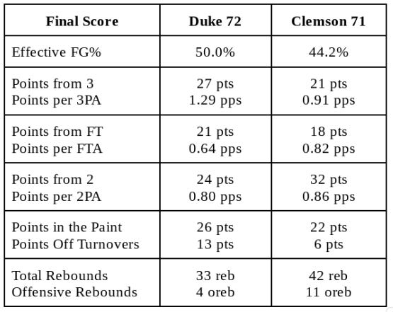 Clemson’s +7 margin in offensive rebounds matched the largest advantage for a Duke opponent so far this season. The Tigers outscored Duke 15-0 in second chance points, with 11 of those coming in the second half. Duke made just 21 of 33 free throws, but was able to gain an edge in effective field goal percentage (+5.8%) thanks to a more efficient performance from three-point range (+0.38 pps). The final 8:13 featured 8 ties and 8 lead changes - credit to both teams for continuing to respond. Trailing 65-69 with 2:06 remaining, Duke recorded 4 consecutive steals (3 by Jared McCain) to keep Clemson off the scoreboard. As Coach Scheyer mentioned, those defensive stops were critical in giving Duke an opportunity at the end.