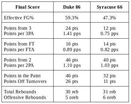 It was a tale of two halves for Duke, especially offensively. While dealing with foul trouble in the first half, the Blue Devils shot just 37.1% from the field, including 0 for 9 from beyond the arc. Syracuse also outrebounded Duke 25-17 before the break. In the second half, Duke made 18 of 24 field goal attempts (75%) and was perfect from three-point range (8/8). Duke flipped the rebounding battle as well, with a 13-6 advantage on the glass after halftime. The Blue Devils finished with five guys in double figures for the second time this season, including 14 points for Tyrese Proctor in just his second game back.