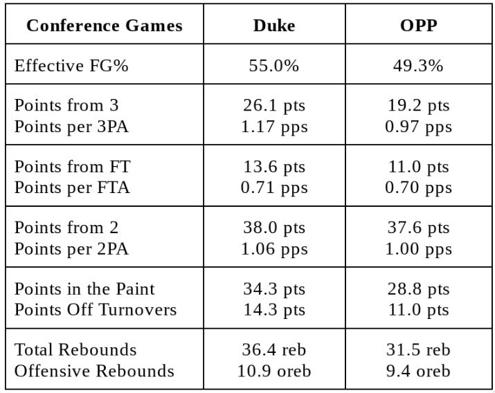 With the ACC regular season complete, here are Duke’s per game averages for conference play.