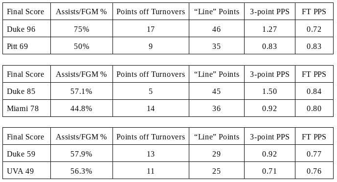 Duke really shared the ball well in Greensboro, including 27 assists against Pittsburgh, an ACC Tournament single-game record. Against Miami, I thought one key was Duke only committing four second half turnovers. Miami’s defense is so aggressive on ball screens and athletic in their full-court press. The Blue Devils turned it over eight times in the first half, so cutting that number down was important for the final 20 minutes. Duke continued to gain an advantage on the glass, totaling 29 second chance points for the three games and outrebounding their opponents in Greensboro by a combined total of 99-79.