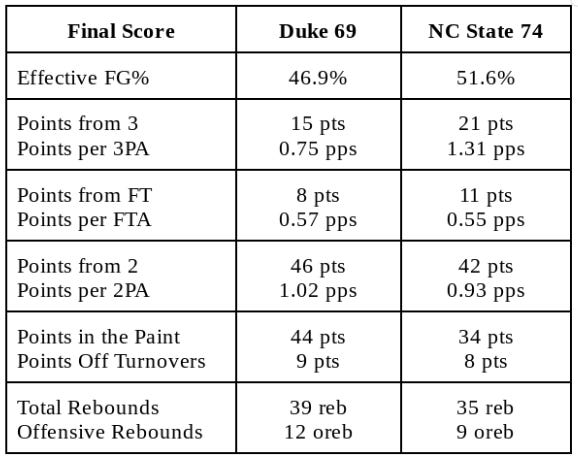 Duke was outscored 18-8 in second chance points (13-6 in the second half). The Blue Devils shot just 5 of 20 from three, with 0.75 points-per-shot matching their second lowest efficiency of the season from three-point range. Despite a 44-34 advantage in points in the paint, Duke was only +2 in paint points after halftime. NC State was +9 in line points (3P+FT), and the Wolfpack led for 32:22. Duke’s 0.99 points-per-possession marked just their fifth game below 1.05 on the season. State had five guys score in double-figures, including Mohamed Diarra’s 14 points to go along with 16 rebounds and 4 blocks. Kyle Filipowski (28/14) and Mark Mitchell (18/8) combined for 46 points and 22 rebounds, while Tyrese Proctor posted 10 points, 7 rebounds, 5 assists, and 0 turnovers in 40:00. Congrats to NC State on the victory.