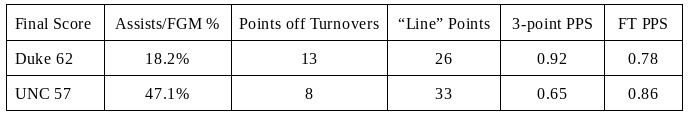 Saturday night in Chapel Hill was a physical game that obviously could have gone either way. Points were difficult to come by and the rebounding battle was dead even at 39-39, including each team grabbing 10 offensive rebounds. Fortunately, Duke was able to convert a few more second chances, gaining a 14-7 advantage over Carolina in second chance points. Three statistics also keyed the Blue Devils in the second half. After the Tar Heels got 9 fast break points in the first half, Duke was able to hold them to 0 points in transition after halftime. Also in the second half, Duke outscored North Carolina in the paint 20-6 and UNC got no points off of turnovers.