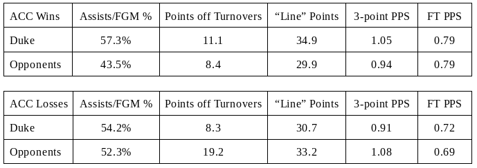 The difference above in conference wins and losses illustrates how thin the margins are in college basketball. The only category showing significant variance is opponents’ points off turnovers. In four of Duke’s six conference losses, opponents scored at least 20 points off turnovers. In games Duke won, only four opponents reached double figures in that category. Duke finished at the top of the conference with a +6.1 rebounding margin in ACC play. Here are the full statistics for Duke’s regular season.