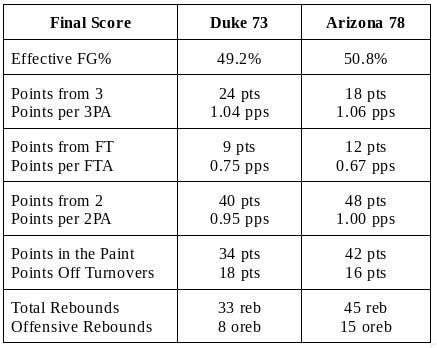 Rebounding and paint points were an obvious advantage for Arizona in a game that was very close in offensive efficiency, and featured 11 ties and 10 lead changes. In the first half, the Wildcats won the offensive glass 11-2, outscoring Duke 10-0 in second chance points before halftime.
